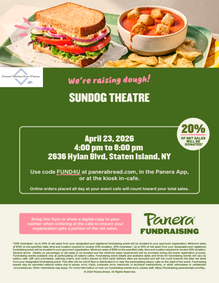 Support Sundog Theatre while enjoying a meal! Visit a participating Staten Island restaurant, show the flyer or say you’re there for Sundog,