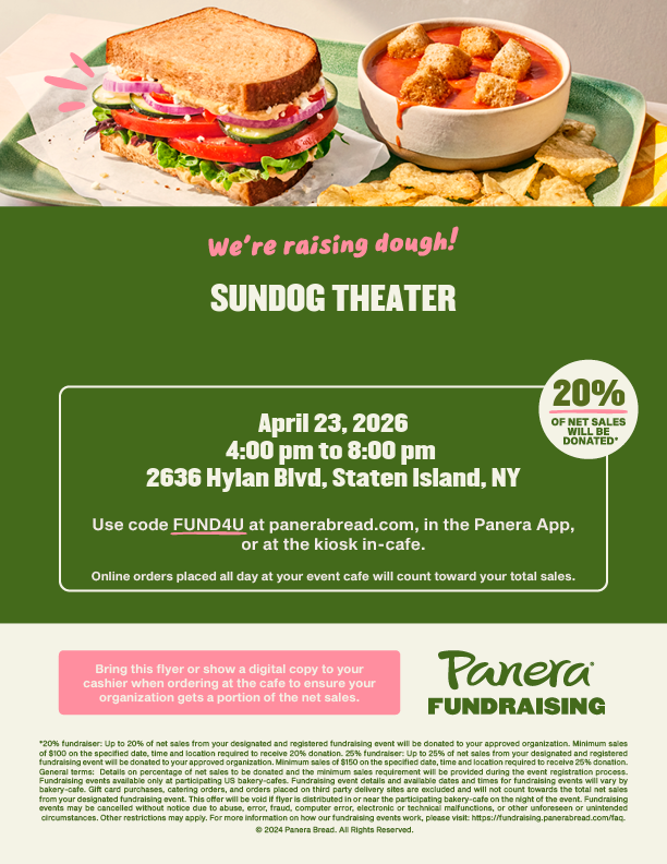 Support Sundog Theatre while enjoying a meal! Visit a participating Staten Island restaurant, show the flyer or say you’re there for Sundog,